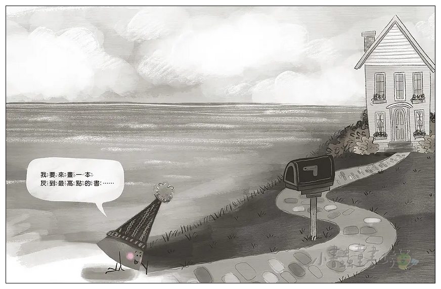 灰灰拿著灰色的筆,畫了一棟在灰色海邊的灰色房子,一隻灰色的狼、灰色的小貓還有灰色的河馬,畫面一片「灰撲撲」,在灰灰的眼裡真是「灰」常完美。
