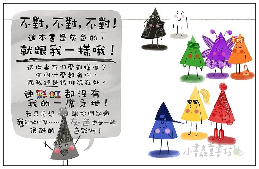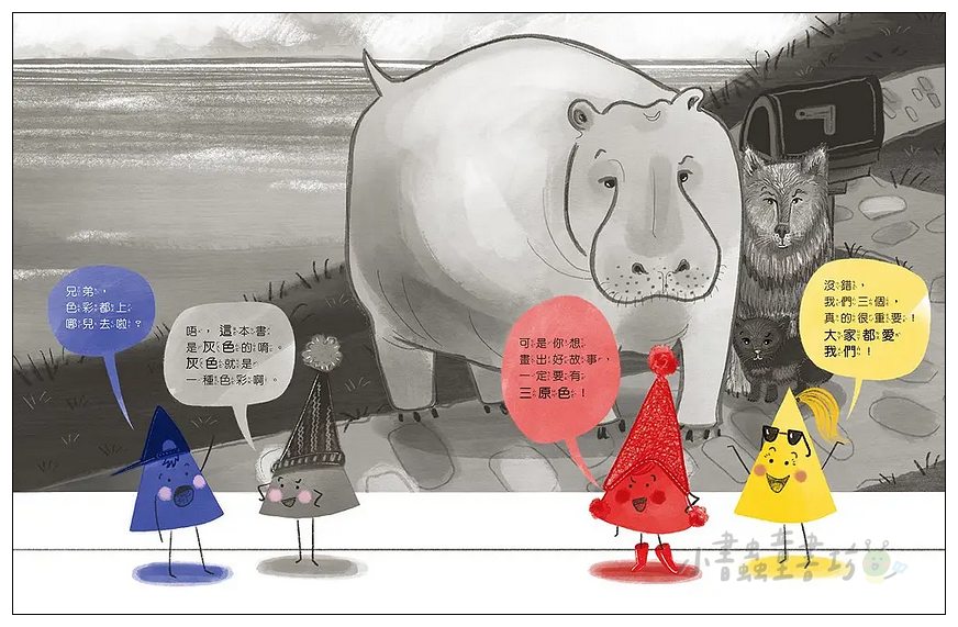 不過,故事才剛起了個頭,三原色就出來七嘴八舌議論紛紛,要不嫌場景色調太灰暗悲慘,要不杞人憂天地擔心故事的走向而頻頻下指導棋;不久,二次色也加入討論的陣容,大家還輪流質疑起為什麼這則故事裡沒有出現任何色彩……