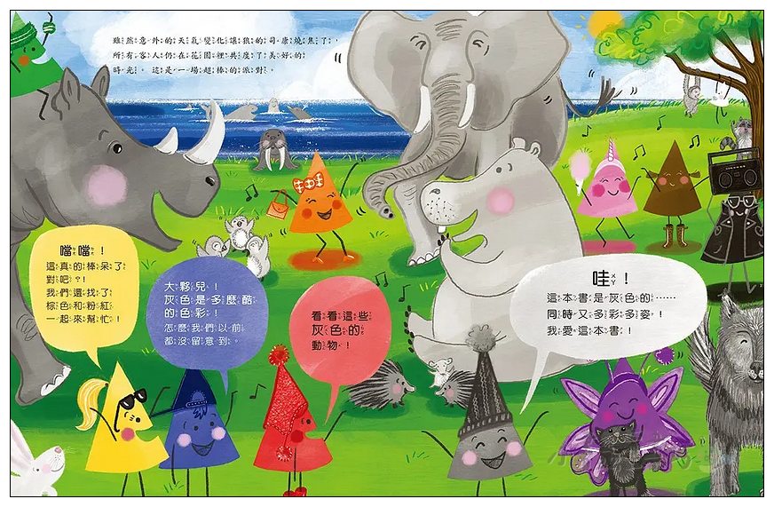 書中的各個色彩,雖然都是以三角形為造型基礎,但巧妙運用了多種配件,例如各式各樣的帽子、搭配不同髮型的髮飾、(太陽)眼鏡、鞋子等,來帶出腳色的特質與個性。簡單可愛且極富表現力的圖像,與詼諧幽默的文字完美相得益彰。