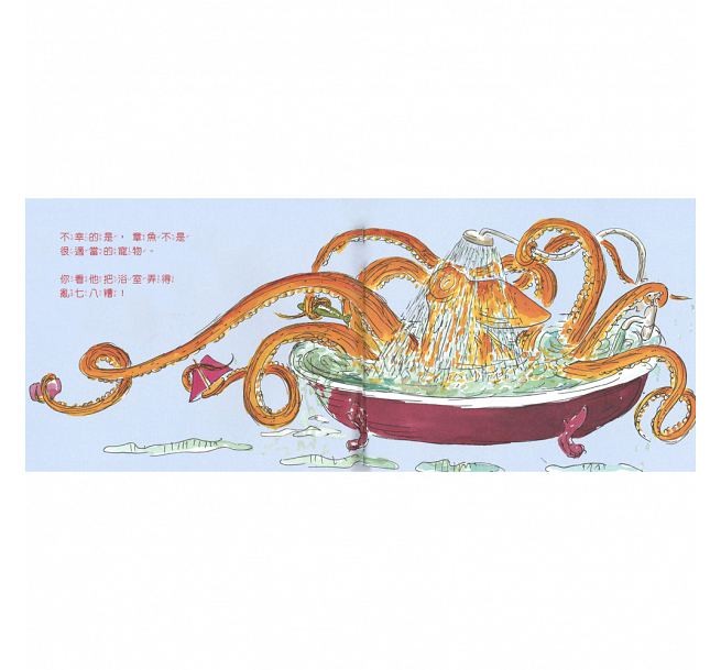 她好喜歡這隻章魚,又大又美麗,好神氣。瑪莉莎還有其他的朋友,他們也都養了令人難以想像的寵物,彼得有一頭大象,強壯又威風,湯馬士養了一隻可愛的鼴鼠,卡洛琳的寵物是一隻長頸鹿……